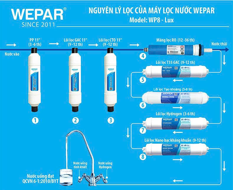 | Cơ cấu: | 8 cấp lọc, nước ra 2 vị tinh khiết và Hydrogen |